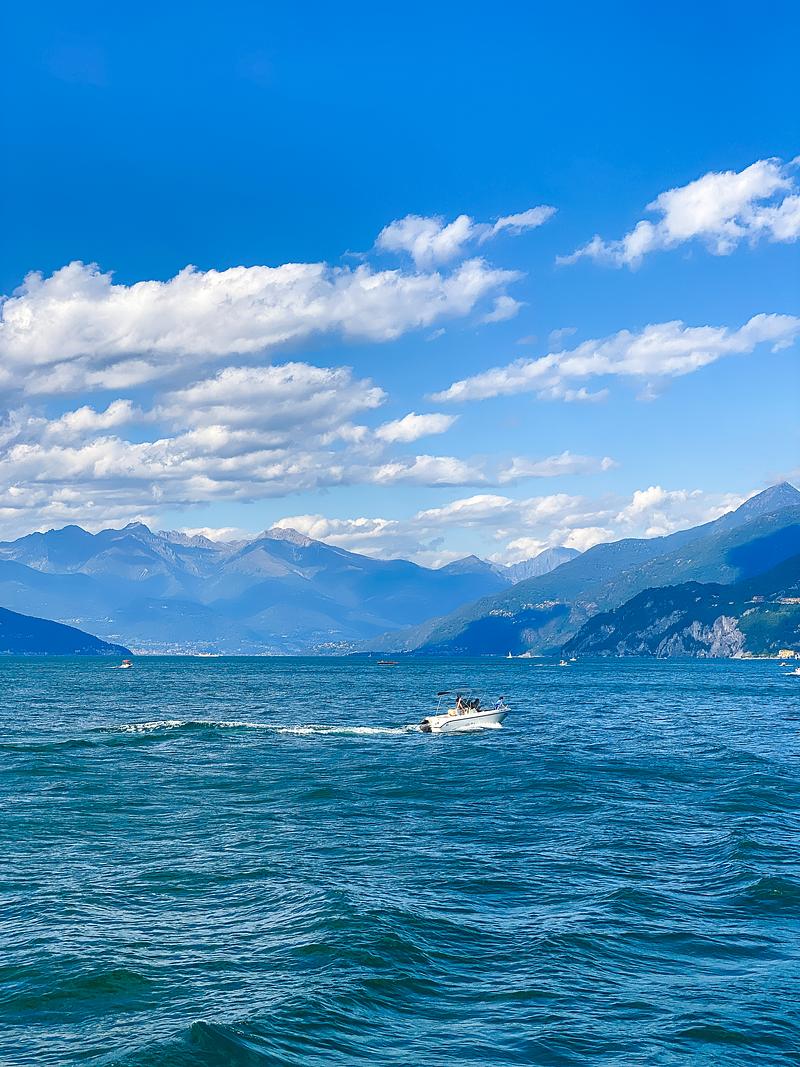 A boat zipping through a beautiful day in Lake Como, Italy.