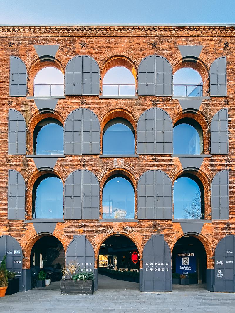 The historic facade of Empire Stores in DUMBO, Brooklyn. Along the waterfront.