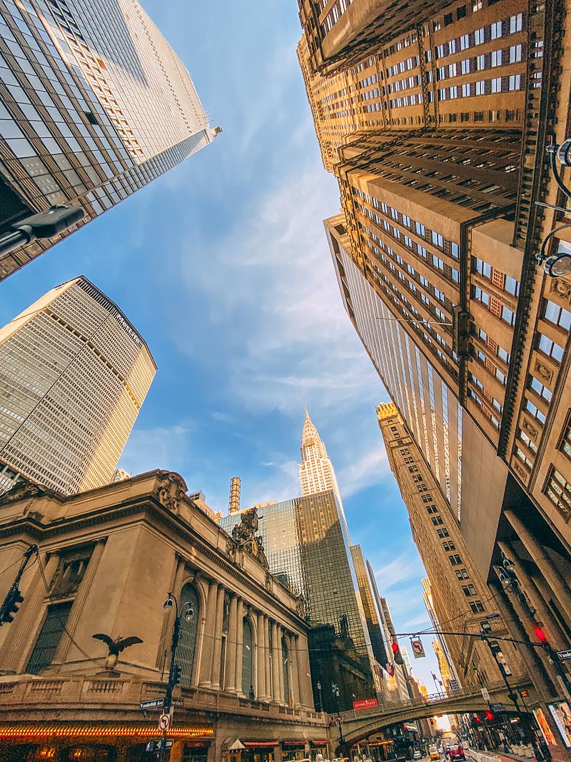 Looking up along 42nd Street with Grand Central Terminal, One Vanderbilt, MetLife Building, and the Chrysler Building.