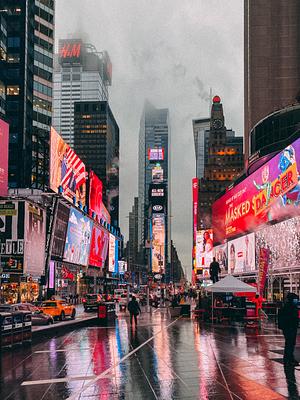 NYC's Times Square on rainy winter day. Looking from Duffy Square down to One Times Square. Shot on December 14th, 2020.