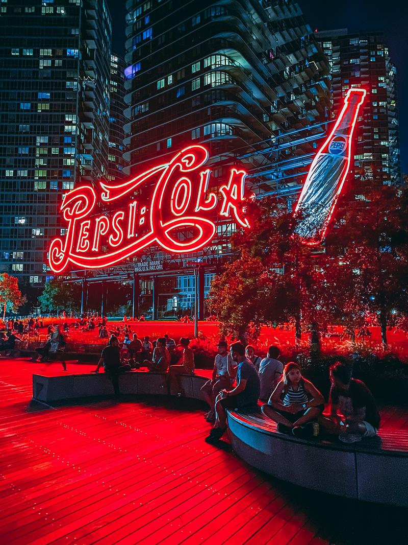 The historic neon sign of Pepsi-Cola along the Long Island City waterfront.