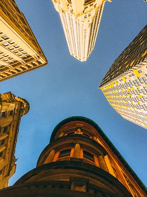 Looking up at the buildings of the Financial District (Downtown Manhattan). The lower center building is the oldest restaurant in NYC: Delmonico's.