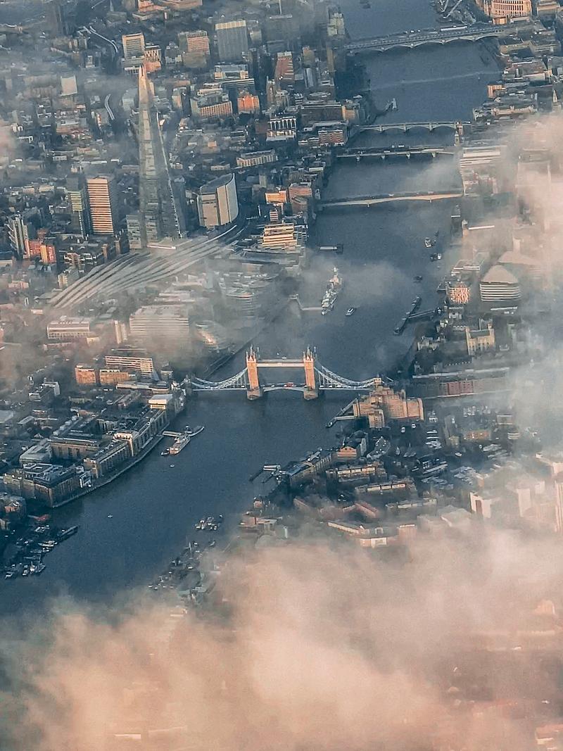 This is view of London's Thames River and Tower Bridge with Shard, as seen from the airplane window flying into Heathrow Airport.
