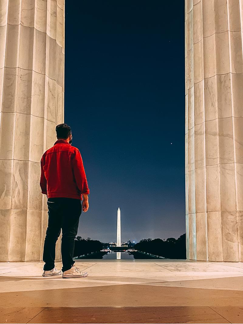 Ariel looking out towards Washington DC's National Mall from the Lincoln Memorial.